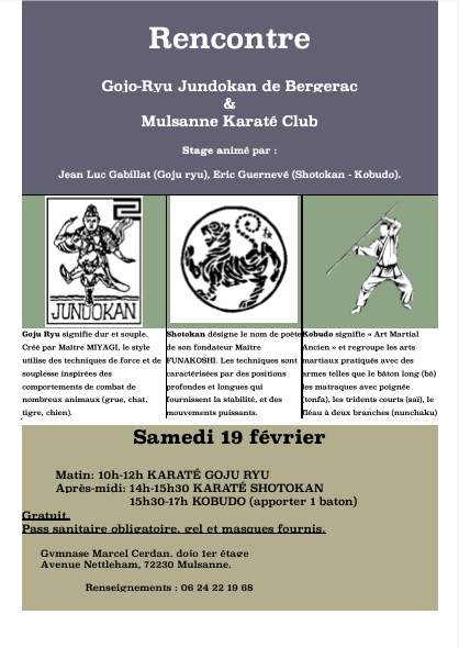 Matin: 10h-12h KARATÉ GOJU RYU Après-midi: 14h-15h30 KARATÉ SHOTOKAN 15h30-17h KOBUDO (apporter 1 baton)